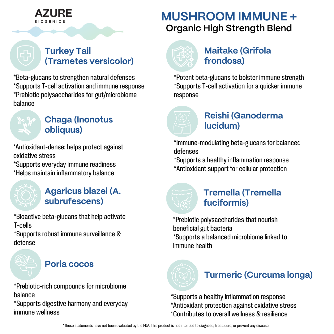 A: It’s designed to broadly support healthy immune function and gut balance with beta-glucans and prebiotic polysaccharides from functional mushrooms.*