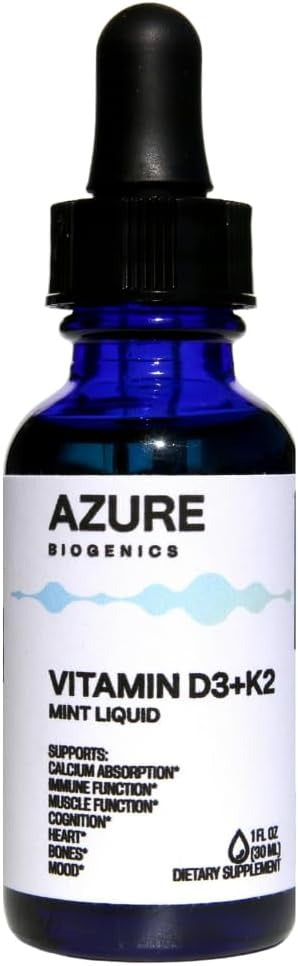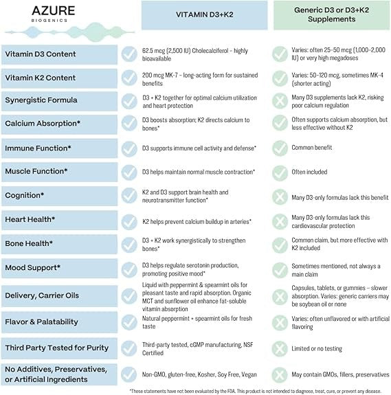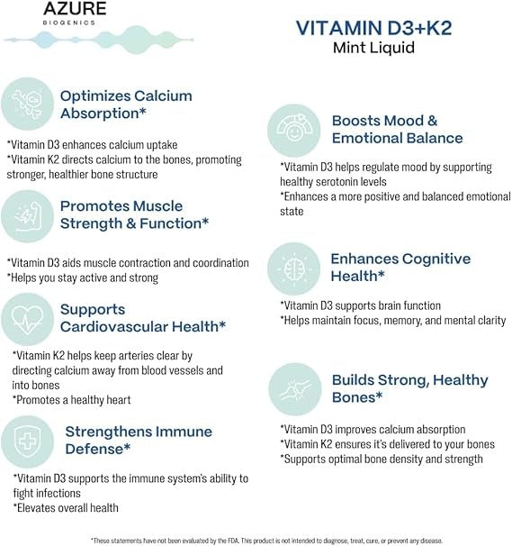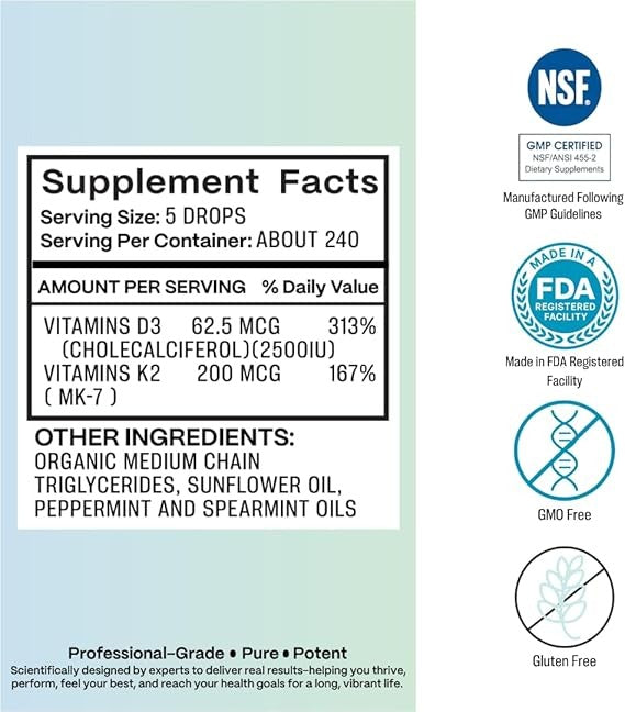 D3+K2 Liquid Mint Drops-High Potency D3 2500 IU, K2 (MK7) 250 mcg- Bioavailable, Fast Absorption- Supports Bone, Immune, Muscle Function, Cognition, Heart & Mood* - Pure Clean Ingredients