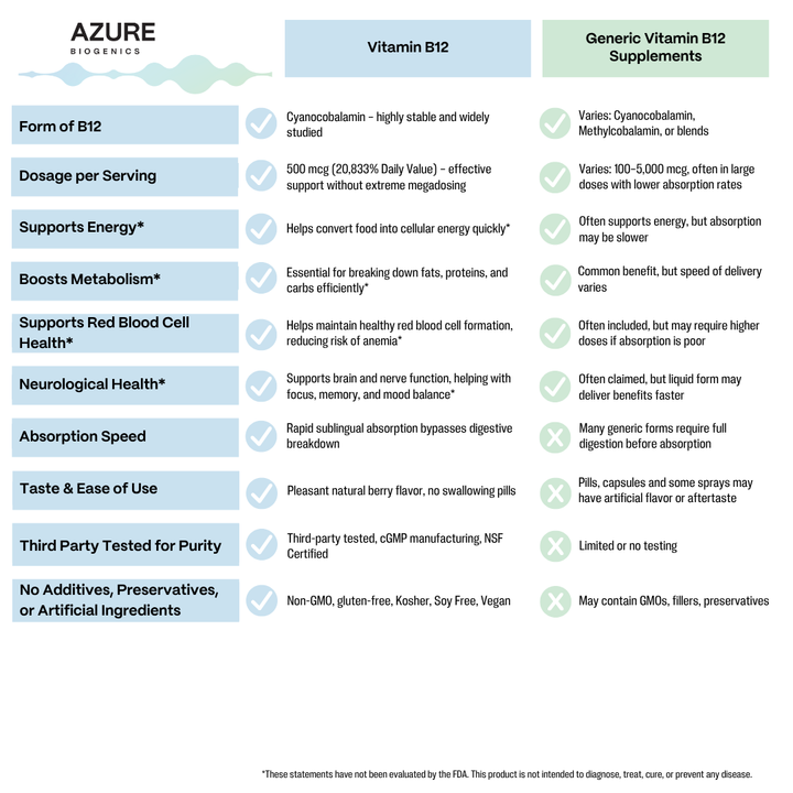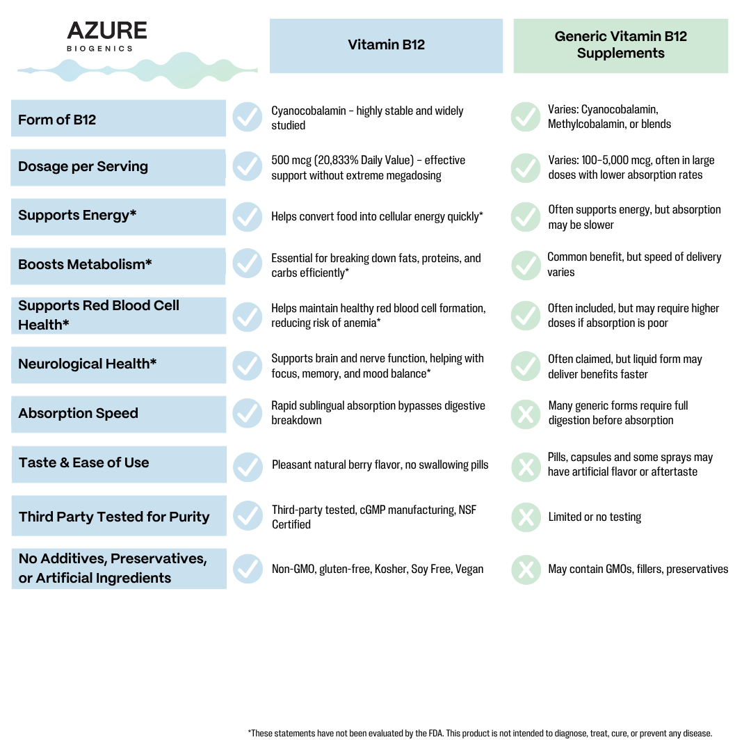 - Steady Energy & Metabolism Support*– Vitamin B12 helps convert food into cellular energy for day-long vitality and focus—without caffeine or sugar jitters.